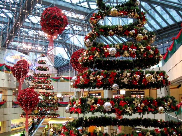 - елочные игрушки разных размеров и цветов(шары, цветы, бусы, банты);