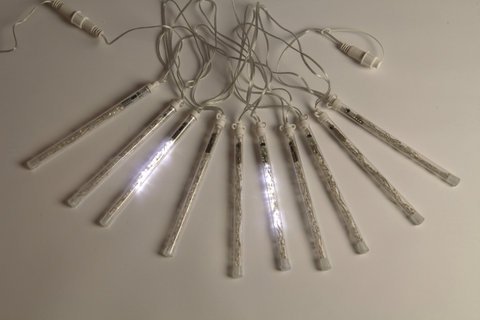 Гирлянда "Тающие сосульки "Мини" из 10 трубочек длиной 20 см, основной шнур 5м. Светодинамика с эффектом «падающей капли». Напряжение 12V (трансформатор 220/12V в комплекте). Влагозащищенная (IP 44). Гирлянды не стыкуются между собой. ДВУСТОРОННИЕ. Цвет:БЕЛЫЙ ХОЛОДНЫЙ